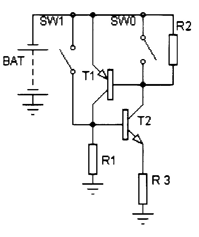 Załącznik przepływu prądu składający się ze źródła prądu, styku załączającego, styku wyłączającego, oporników, tranzystorów i odbiornika prądu charakteryzuje się tym, że po zwarciu styku (SW1), przepływający przez opornik (R1) prąd polaryzuje bazę tranzystora (T2) wymuszając przepływ prądu przez opornik (R2), co jest przyczyną polaryzacji baty tranzystora (T1), skutkiem czego po otwarciu styku (SW1) prąd w dalszym ciągu przepływa przez opornik (R1), co przy spolaryzowanej bazie tranzystora (T2) wymusza przepływ prądu przez odbiornik (R3), przy czym zwarcie styku (SWO) znosi polaryzację bazy tranzystora (T1) i odcina przepływ prądu ze źródła (BAT) do odbiornika (R3).