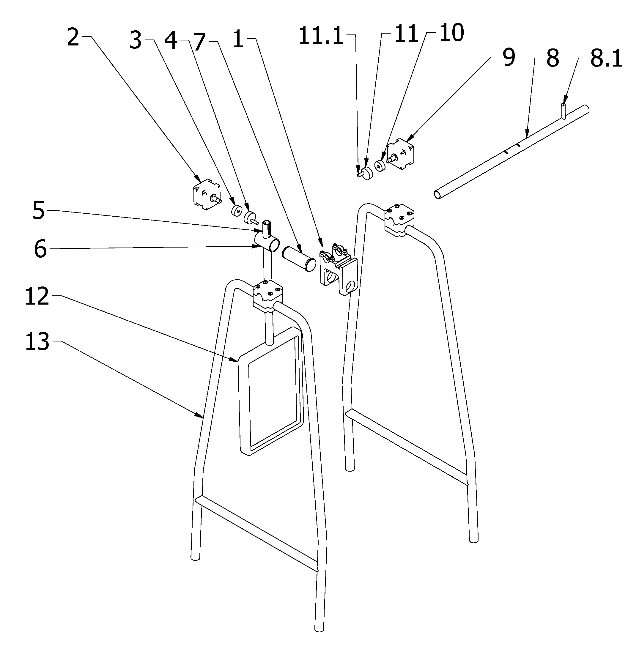 Przedmiotem zgłoszenia jest mechanizm wychylania uchwytu wiszącej tablicy reklamowej w dwóch osiach, zawierający poziomo ułożoną belkę znajdującą się pomiędzy podporami, przy czym do belki zamocowany jest uchwyt w postaci pręta skierowanego ku dołowi, do którego zamocowana jest tablica reklamowa (12). Charakteryzuje się on tym, że uchwyt (5) zamocowany jest w korpusie (1) w postaci ceownika, który posiada dwie ściany boczne zaś do jednej z nich od zewnętrznej strony zamocowany jest pierwszy silnik elektryczny (2) z wałem znajdującym się w wybraniu ściany bocznej i podstawy korpusu (1). Do wału pierwszego silnika elektrycznego (2) zamocowane jest pierwsze koło (3) ze znajdującym się od strony jego podstawy pierwszym trzpieniem, ułożonym niewspółosiowo do osi koła (3) tudzież trzpień znajduje się w rowku znajdującym się w górnej części uchwytu (5). Dłuższe ściany rowka są ułożone wzdłuż osi uchwytu (5). Górna część uchwytu (5) znajduje się pomiędzy ścianami bocznymi korpusu (1). Pod rowkiem do uchwytu (5) prostopadle do jego osi zamocowana jest tuleja (6), w której znajduje się trzpień (7) osadzony obrotowo w otworach znajdujących się w ścianach bocznych korpusu (1) tudzież belka (8), do której zamocowany jest nieobrotowo korpus (1), zamocowana jest obrotowo wokół jej osi pomiędzy podporami, zaś do podpory zamocowany jest drugi silnik elektryczny (9) z wałem ułożonym równolegle do osi belki (8). Do wału drugiego silnika elektrycznego (9) zamocowane jest drugie koło (10) ze znajdującym się od strony jego podstawy drugim trzpieniem (11.1), ułożonym niewspółosiowo do osi drugiego koła (10). Belka (8) posiada trzeci trzpień (8.1) ułożony prostopadle do jej osi i stykający się w pozycji wyjściowej z drugim trzpieniem (11.1).