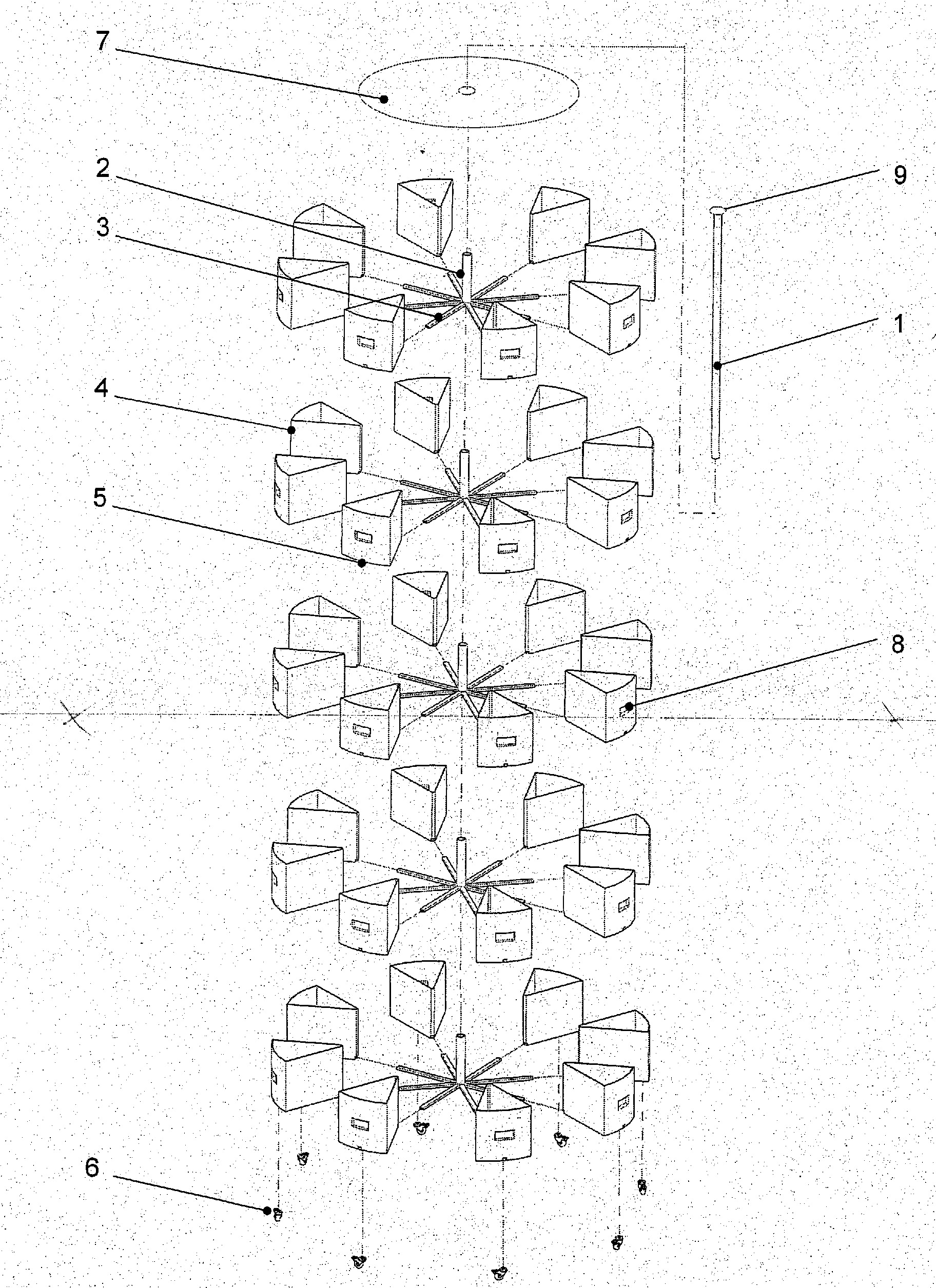Celem zgłoszenia jest magazynowanie i transportowanie narzędzi. Istotą rozkładanego wózka ręcznego składającego się z pojemników, słupka i zestawu prowadnic jest to, że na pierwszym poziomie do słupka (1) zamocowana jest obrotowo tuleja (2), zaś do tulei (2) zamocowane są promieniście poziome prowadnice (3), do których zamocowane są rozłącznie pojemniki (4) w kształcie wycinka walca, które w dolnej części w ich osi symetrii posiadają uformowany kanał (5).