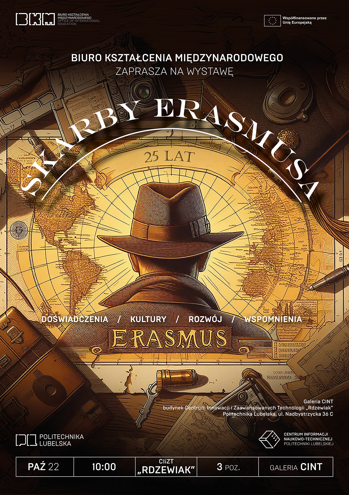 The exhibition was created on the occasion of the 25th anniversary of the Erasmus+ programme at Lublin University of Technology. It featured mainly photographs and artefacts from journeys made over a quarter of a century by students and staff of Lublin University of Technology to various corners of the world as part of international exchanges. The artefacts consisted of items brought back as souvenirs (a wide variety of figurines, statuettes, key rings, magnets and other small items) and items such as tickets, small packages, maps, postcards, brochures, etc. There were also items of regional costumes from various parts of the world. Memories of the trips of several PL employees (recorded and presented in the form of video statements) were also part of the exhibition, as well as a ‘travel photo booth’ - a place where it was possible to take an instant photo against a background prepared for the exhibition and paste it into a special ‘travel diary’.