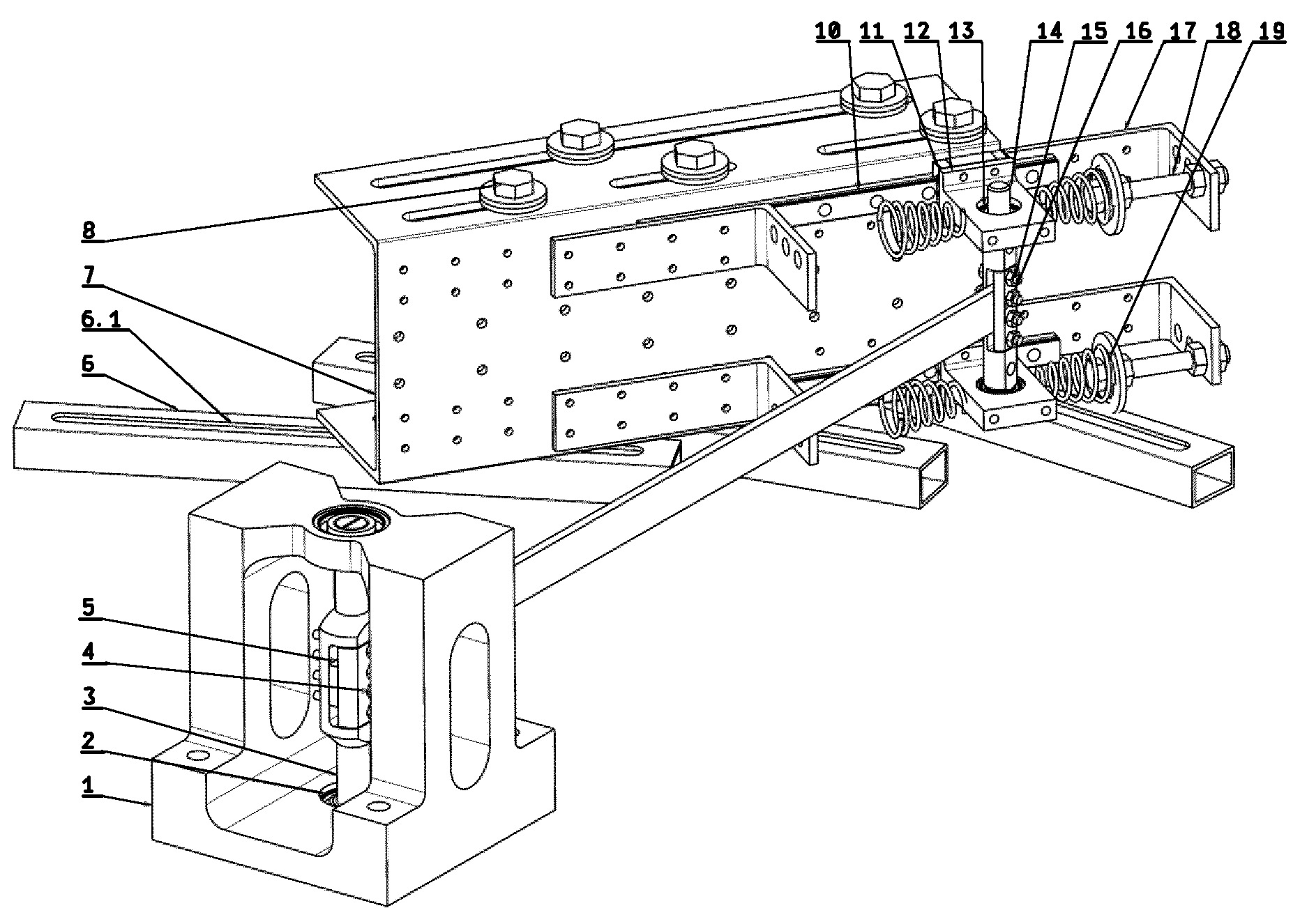 Uchwyt do belek o warunkach brzegowych typu zawias-swobodne podparcie z elastycznym elementem na końcu do montażu na wzbudniku elektromechanicznym w orientacji poziomej