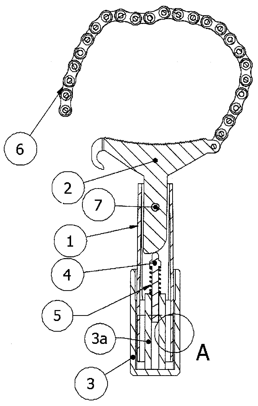 Przedmiotem zgłoszenia jest klucz dynamometryczny, zwłaszcza do dokręcania filtrów puszkowych typu spin - on. Klucz dynamometryczny posiada głowicę klucza, obudowę mechanizmu, łańcuch, obrotową rękojeść. Charakteryzuje się on tym, że rękojeść (3) posiada cylindryczny kształt i w jej wewnętrznej środkowej części znajduje się tuleja (3a). Na ściance rękojeści (3) od wewnętrznej strony znajduje się gwint, w który wkręcony jest gwint znajdujący się na zewnętrznej części korpusu klucza (1). W tulei (3a) umieszczony jest trzpień (4) ze sprężyną naciskową (5), która oparta jest dolną częścią o tuleję (3a). Górną częścią oparta jest o wypust trzpienia (4), przy czym trzpień (4) styka się swoim górnym końcem z dolnym końcem głowicy klucza (2), której dolna część zamocowana jest ruchomo w korpusie klucza (1) za pomocą sworznia (7). Do górnej części głowicy klucza (2) zamocowany jest łańcuch (6).