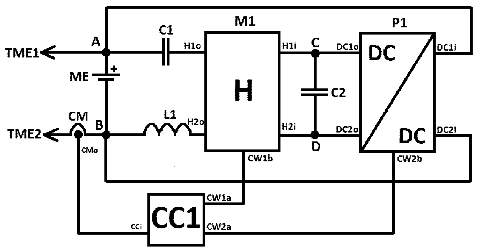 Przedmiotem zgłoszenia jest układ, sposób oraz produkt komputerowy do rezonansowej kompensacji pulsacji prądu, zwłaszcza elektrochemicznych magazynów energii. Układ charakteryzuje się tym, że pierwszy terminal (TME1) połączony jest z pierwszym węzłem (A) a drugi terminal (TME2) połączony jest z drugim węzłem (B) poprzez układ do pomiar prądu (CM). Pomiędzy pierwszy węzeł (A) i pierwsze wyjście (H1o) mostka tranzystorowego w układzie H (M1) włączony jest kondensator rezonansowy (C1). Pomiędzy drugi węzeł (B) i drugie wyjście (H2o) mostka tranzystorowego H (M1) włączona jest cewka rezonansowa (L1). Pierwsze wejście (H1i) mostka tranzystorowego H w układzie (M1) połączone jest z pierwszym wyjściem (DC1o) izolowanej galwanicznie przetwornicy DC/DC (P1) za pośrednictwem trzeciego węzła (C). Drugie wejście (H2i) mostka tranzystorowego w układzie H (M1) połączone jest z drugim wyjściem (DC2i) izolowanej galwanicznie przetwornicy DC/DC (P1) za pośrednictwem czwartego węzła (D). Pierwsze wejście (DC1i) izolowanej galwanicznie przetwornicy DC/DC (P1) połączone jest z pierwszym węzłem (A). Drugie wejście (DC2i) izolowanej galwanicznie przetwornicy DC/DC (P1) połączone jest z drugim węzłem (B), przy czym pomiędzy pierwszy węzeł (A) i drugi węzeł (B) włączony jest magazyn energii (ME), tudzież pomiędzy trzeci węzeł (C) i czwarty węzeł (D) włączony jest kondensator szyny DC (C2). Wyjście pomiarowe (CMo) układu do pomiaru prądu (CM) połączone jest z wejściem pomiarowym (CCi) układu sterowania (CC1). Pierwsze wyjście (CW1a) układu sterowania (CC1) połączone jest z wejściem sterującym (CW1b) mostka tranzystorowego w układzie H (M1), tudzież drugie wyjście (CW2a) układu sterowania (CC1) połączone jest z wejściem sterującym (CW2b) izolowanej galwanicznie przetwornicy DC/DC (P1). Sposób polega na tym, że mierzy się za pomocą układu do pomiaru prądu (CM) i wejścia pomiarowego układu do pomiaru prądu (CCi) amplitudę pulsacji prądu układu (iM) z magazynem energii (ME) i jednocześnie oblicza się z wykorzystaniem amplitudy pulsacji prądu układu (iM) sygnał referencyjny (Idc) dla izolowanej galwanicznie przetwornicy DC/DC (P1) oraz sygnały sterujące (a, b, c, d) dla mostka tranzystorowego w układzie H (M1). Następnie przesyła się sygnały sterujące (a, b, c, d) z pierwszego wyjścia (CW1a) układu sterowania (CC1) do wejścia sterującego (CW1b) mostka tranzystorowego w układzie H (M1). Jednocześnie przesyła się sygnał referencyjny (Idc) z drugiego wyjścia (CW2a) układu sterowania (CC1) do wejścia sterującego (CW2b) izolowanej galwanicznie przetwornicy DC/DC (P1), przez co wzbudza się obwód rezonansowy cewki rezonansowej (L1) i kondensatora rezonansowego (C1) tłumiąc amplitudę pulsacji prądu (iME) magazynu energii (ME). Produkt komputerowy, charakteryzuje się tym, że zawiera oprogramowanie zawarte w układzie sterującym (CC1) realizujące sposób w układzie, przy czym w produkcie tym sygnał (iM), będący odczytem z wejścia pomiarowego (CCi) układu sterującego (CC1) skaluje się oraz filtruje, a następnie przesyła się do bloku synchronizacji, gdzie wyznacza się sygnał synchronizacji (θ). Sygnał referencyjny składowej q (Iq_ref) przesyła się na blok skalowania, którego sygnał wyjściowy będący korektą sygnału synchronizacji (θq) przesyła się wraz z sygnałem synchronizacji (θ) do bloku generacji sygnałów sterujących, którego sygnały wyjściowe (a, b, c, d) są sygnałami sterującymi dla mostka tranzystorowego w układzie H (M1). Sygnał referencyjny składowej d (Id_ref) przesyła się do bloku skalowania, którego sygnał wyjściowy jest sygnałem referencyjnym (Idc) dla izolowanej galwanicznie przetwornicy DC/DC (P1).