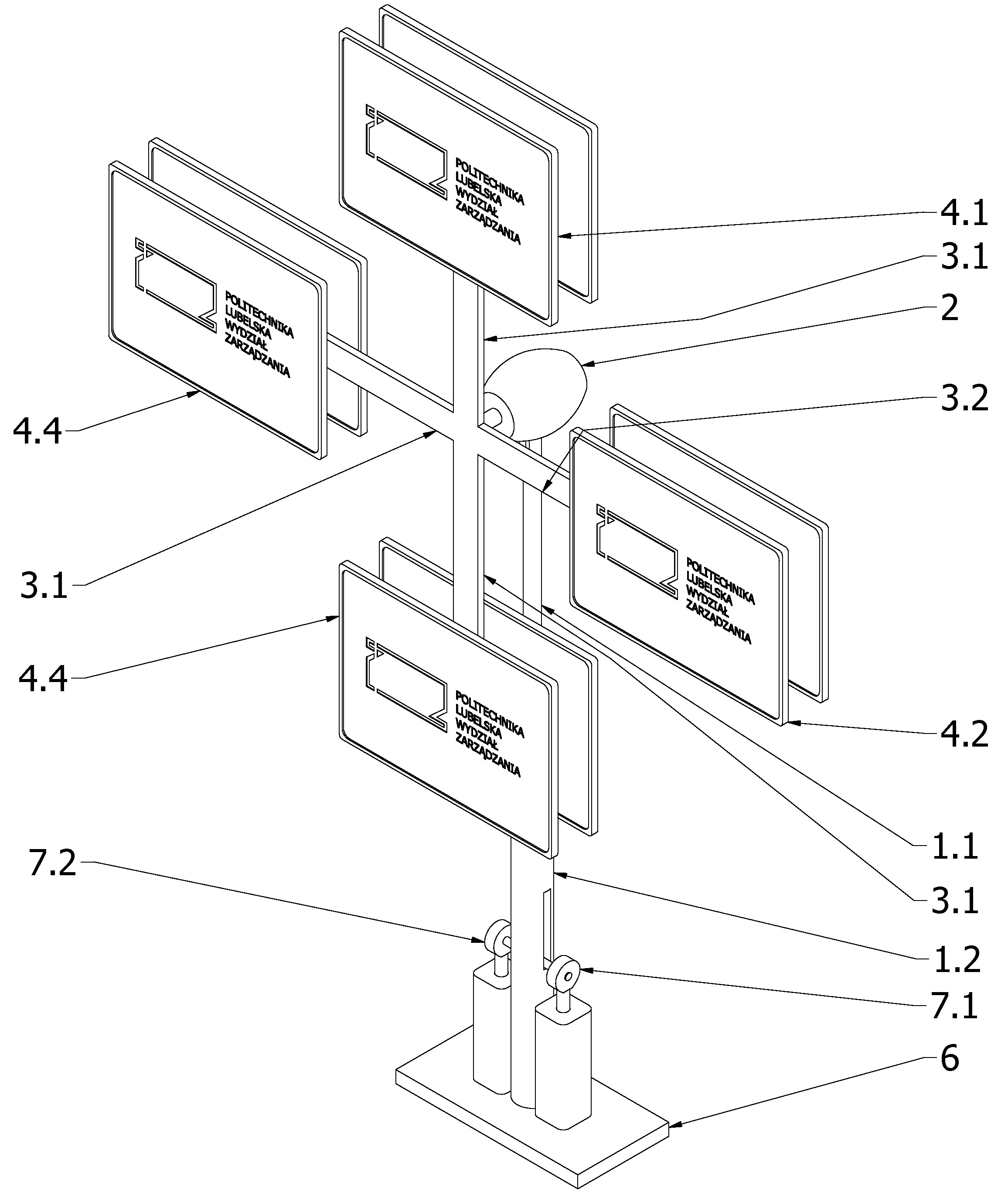 | dc.abstract.pl | Przedmiotem zgłoszenia jest wiatrak reklamowy podnoszony, zamocowany na słupie (1), do którego zamocowany jest silnik elektryczny (2). Charakteryzuje się on tym, że na wale pierwszego silnika elektrycznego (2), o osi ułożonej prostopadle do osi słupa (1) zamocowane są pierwszymi końcami ramiona (3.1, 3.2). Oś każdego z ramion (3.1, 3.2) ułożona jest prostopadle do osi silnika (2). W drugiej końcowej części każdego z ramion (3.1, 3.2) zamocowana jest obrotowo tablica reklamowa (4.1, 4.2), o osi obrotu ułożonej równolegle do osi pierwszego silnika elektrycznego (2). W dolnej części każdej z tablic reklamowych (4.1, 4.2, 4.4) zamocowany jest obciążnik. Słup (1.1) zamocowany jest przesuwnie w tulei (1.2) zamocowanej do podstawy (6) oraz słup (1.1) połączony jest za pomocą siłowników (7.1, 7.2), z podstawą (6). | |